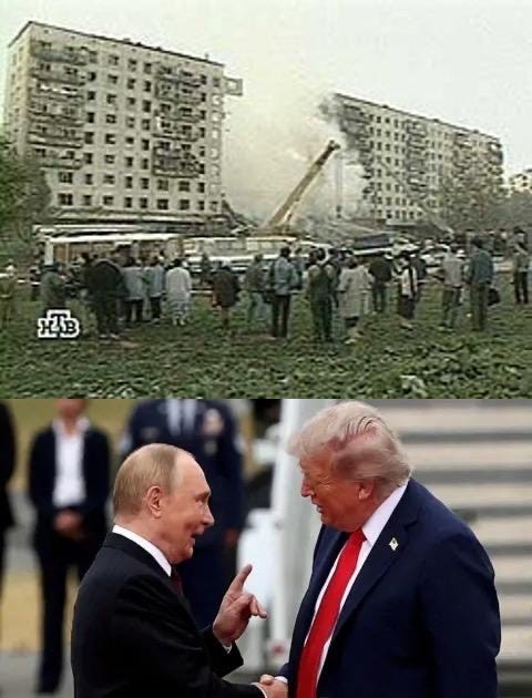 If you want to understand the evil Trump appears to be following, consider Putin’s rise. In 1999, a series of apartment bombings across Russia killed roughly 300 civilians. The attacks were officially blamed on Chechen militants and used to justify sweeping domestic repression and the Second Chechen War—consolidating public support for expanded state power and rapidly accelerating Putin’s ascent. Subsequent evidence and credible investigations strongly suggest the bombings were not the work of Chechen militants at all, but were instead orchestrated by Russia’s own security services. In the city of Ryazan, residents discovered sacks of hexogen explosives planted in an apartment basement; local authorities initially treated the incident as a genuine terrorist attack, only for the FSB to later claim it had been a “training exercise.” Former FSB officers and independent investigators have since alleged that the apartment bombings were a false-flag operation carried out by the FSB itself. At the time, Putin was a former FSB director, deeply embedded in the very security apparatus that would soon become the backbone of his regime.